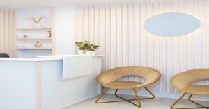 Minimalist and chic interior of a reception of beautician clinic with counter and chairs_j by Eli Gordon | Sep 25, 2025